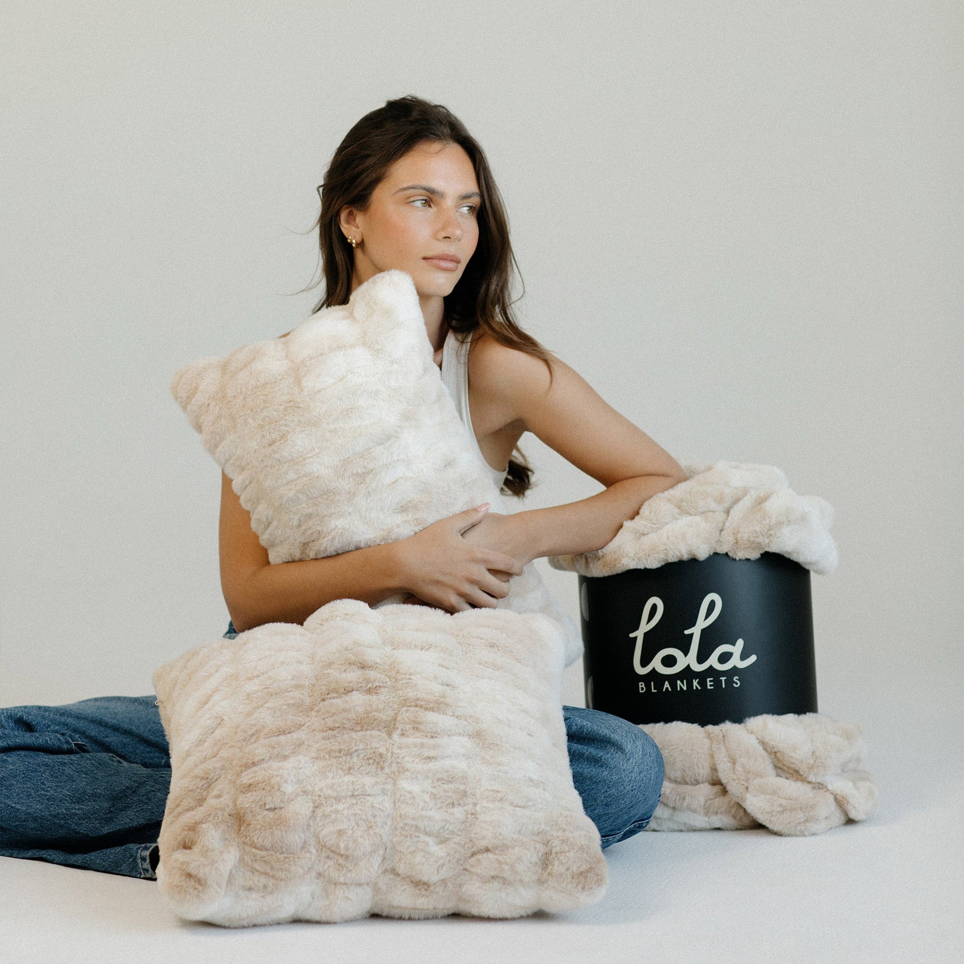 Our original Lola Blanket, now in pillow form. Thoughtfully designed to pair perfectly with your Lola Blanket, our Lola Pillow brings the same signature double-sided fabrication and quality you know and love. Each pillow includes a therapeutic vegan down alternative insert.